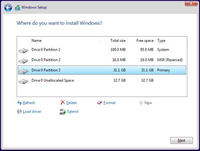Ensure that the partition which is about 32 GB in size (but is not Unallocated space) is highlighted, then click the "Next" button: