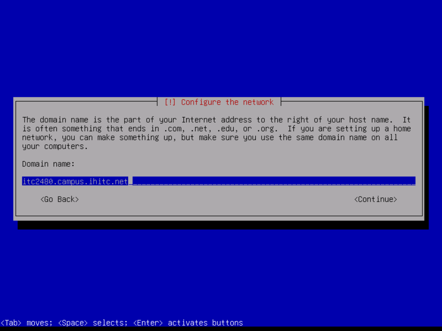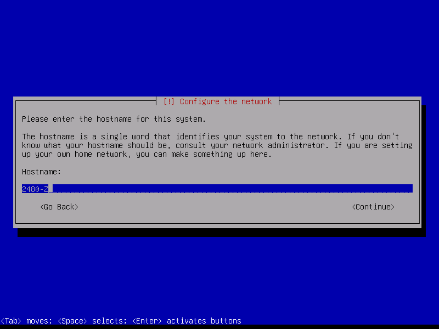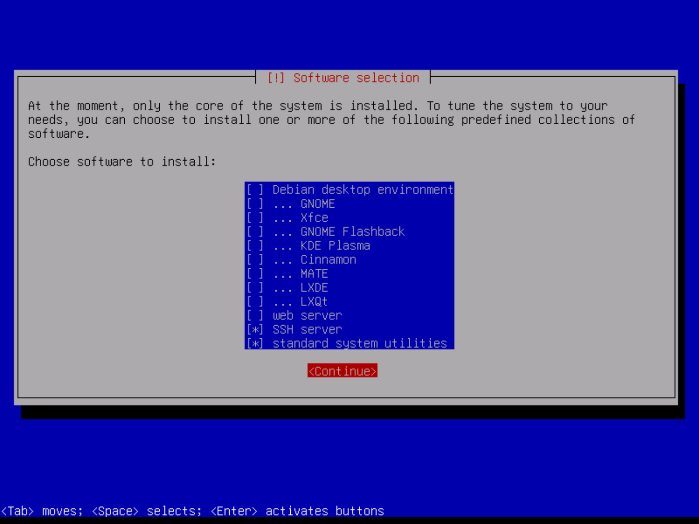 In the installer you will use the space bar to select and unselect "checkboxes", the tab key to move between fields and buttons, and the enter key to continue. You will be prompted for the following choices: