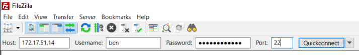 Run FileZilla and use the Quick Connect bar at the top of the screen to access your system.