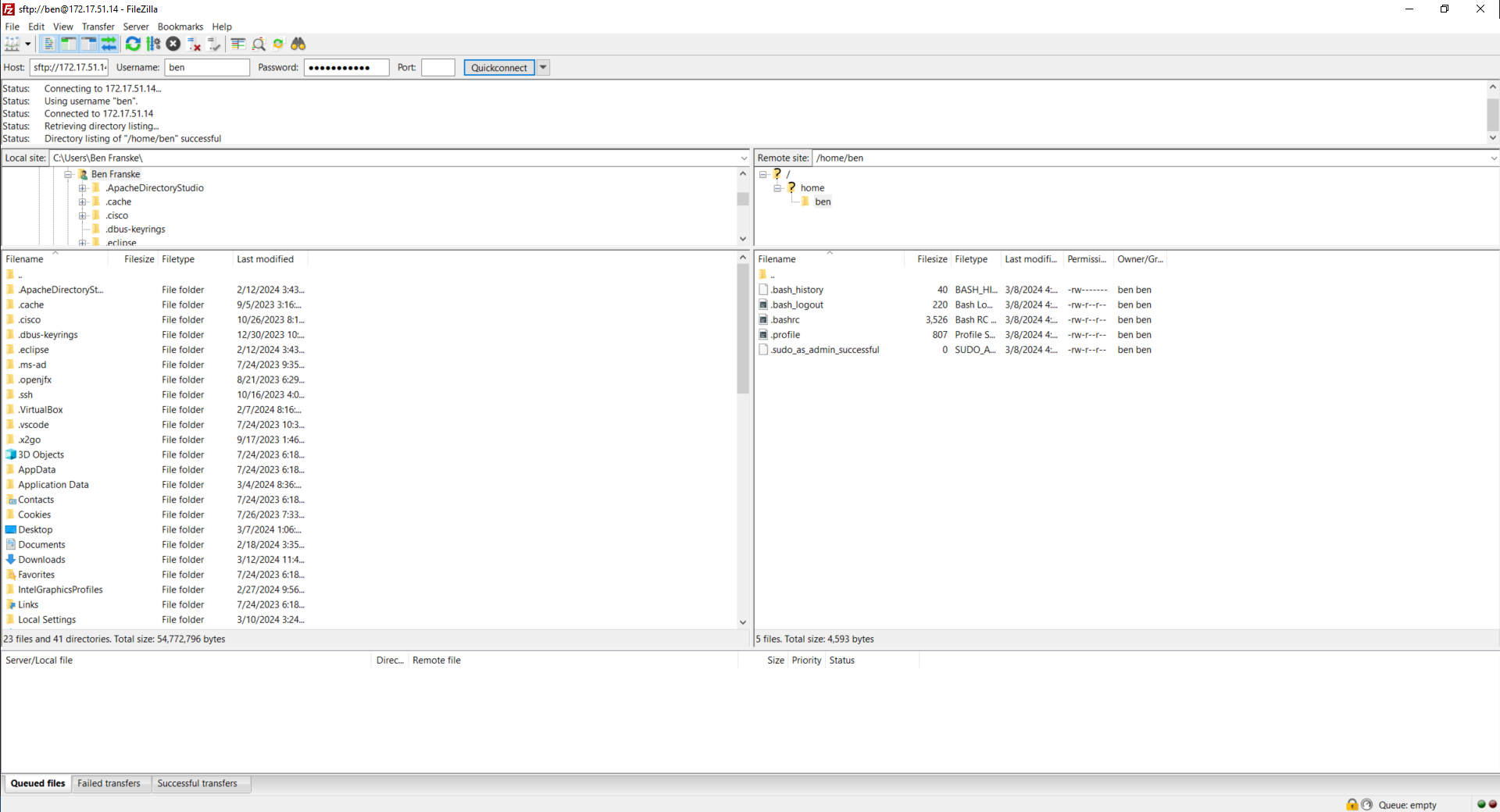 You should see some connection text scroll on the top of the screen and some files on the right side of the screen now such as .bashrc and .profile The right side of the screen is the drive on your Linux system and the left side of the screen is the drive on your home system. Files and folders can be dragged between the two sides to transfer them back and forth.