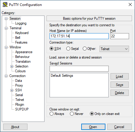 Run the PuTTY software on your computer (or the Windows Administrative PC) and enter in the IP address of your Linux server VM in the "Host Name" box and click the "Open" button.