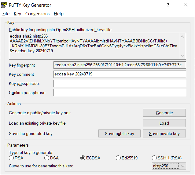 ben@2480-Z:~$ ssh-keygen Generating public/private rsa key pair. Enter file in which to save the key (/home/ben/.ssh/id_rsa): Enter passphrase (empty for no passphrase): Enter same passphrase again: Your identification has been saved in /home/ben/.ssh/id_rsa Your public key has been saved in /home/ben/.ssh/id_rsa.pub The key fingerprint is: SHA256:eo/4uzW0+aRzZvNemgK6Hmx4gxE5/C6zww0g5/bduSM ben@2480-Z The key's randomart image is: +---[RSA 3072]----+ | | | . . | | = | | . o + | | + .. S . | | o .B ..o | | . o*+Oo=o. .| | +OE*==* + | | o+B=+B.== | +----[SHA256]-----+ ben@2480-Z:~$ -