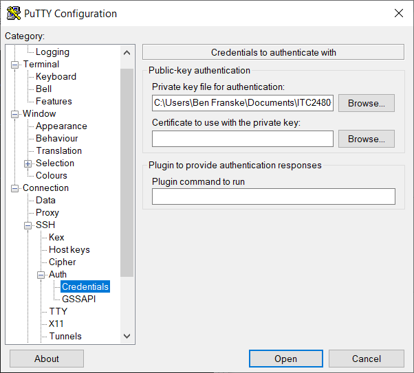 Click the "Browse" button next to "Private key file for authentication" and find the PPK file you saved previously from PuTTY Key Generator. It should look something like this:
