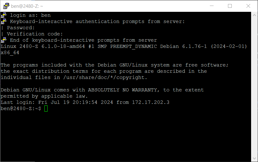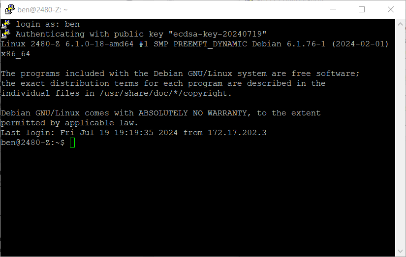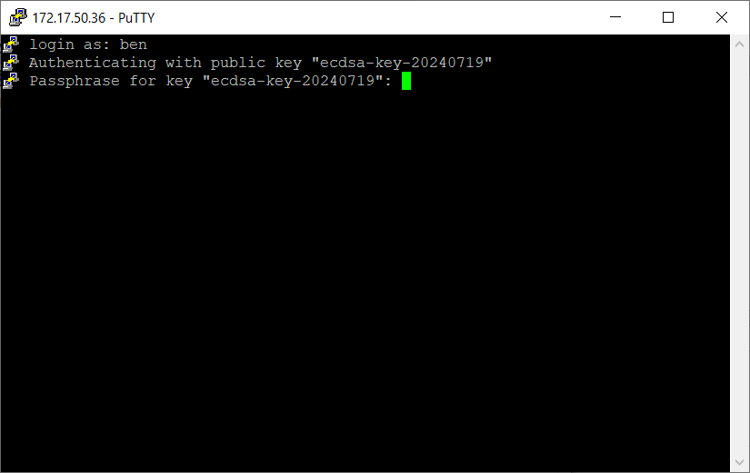 If you did not set a key passphrase you should immediately be logged in, if you did set a key passphrase you will be prompted to enter it before the connection is made. Note that this is your key passphrase you created on your client when you created the key and which may be entirely unrelated to your Linux server account password, we are not using passwords to authenticate with this method.